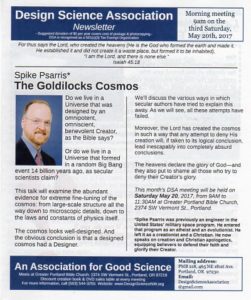 The Goldilocks Cosmos by Spike Psarris (meeting announcement). p. 1